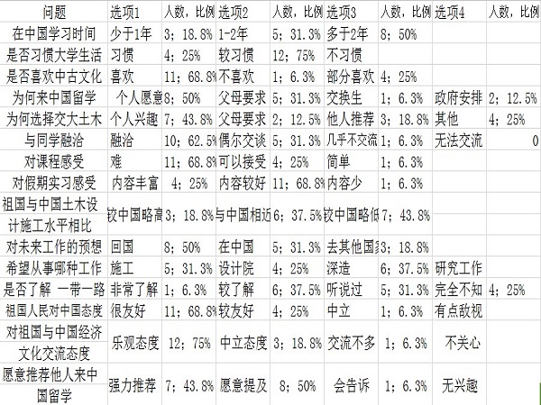 就业指导中心旨在了解土木专业留学生在我校的生活状态,学习情况,以及对中国一带一路新政策了解程度及态度看法。部分成员于7月,9月在犀浦校区天佑斋22栋,鸿哲斋向一些本专业留学生分发了调查问卷,就为什么会来中国,西南交大学习土木工程专业?对交大土木专业课程,假期实习的感受?对未来工作的预想及对一带一路政策的相关看法等问题对来自也门,越南等国家的16名留学生进行了考察。